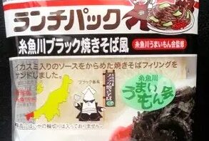 ランチパック ランチパックシリーズ - 糸魚川ブラック焼きそば風 - パッケージにイカのスタイルでいかつい顔したブラック番町が描かれた、糸魚川うまいもん会監修の、ヤマザキランチパックです。 2025.10.12 ランチパック