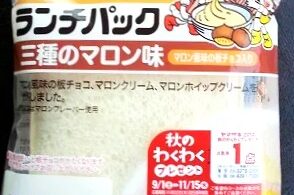 マロンクリーム・マロン風味の板チョコ・マロンホイップクリームの3つのマロンの味わいが楽しめる、ヤマザキランチパックです。