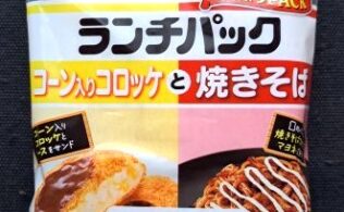 コーン入りコロッケと焼きそばを2枚のパンに別々にサンドした、 2つのおいしさが楽しめる・よくばりPACK の、ヤマザキランチパックです。