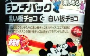 いつもの白色のパンに黒い板チョコを入れ、ココア風味のこげ茶色のパンに白い板チョコを入れて2つの味が楽しめる、ディズニーとコラボしたヤマザキランチパックです。