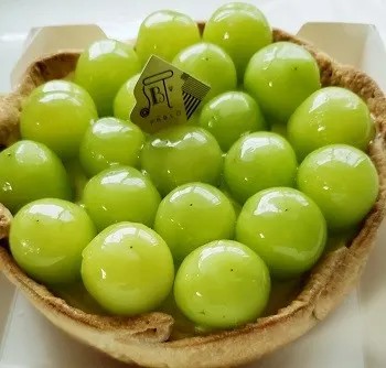 店頭のショーケースをみると、1ホール直径約15cmの表面に、20粒の岡山県産シャインマスカット晴王が、タルトの上一面に隙間なく並んでいました。 このチーズタルトの名前は、岡山“晴王”の贅沢シャインマスカットチーズタルトです。