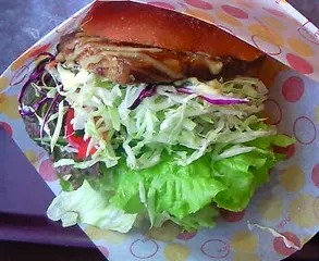 写真のようにレタスとキャベツが溢れています。実はこのハンバーガーですが、お肉を使っておらず、小麦粉・玉子・おから・蒟蒻粉などで、肉に変わる独自のパテを作っています。確かにヘルシーですが、さてどんな感じでしょう?とにかくキャベツの千切りが多くて、なかなかパテまでたどり着きません。キャベツとレタスだけでも、結構ヘルシーです。そしてやっとの思いで、花巻バーガーのパテが口の中に入りました。うん・・・やはりお肉のようなボリュームはありませんが、しっかりとした弾力があるパテです。味も甘辛いソースの照り焼き風で、マヨネーズもいい演出をしています。でも全体的な味はシンプルです。