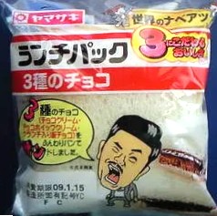 今回のランチパックは、2009年1月に発売された 3種のチョコ です。パッケージに、お笑い芸人の世界のナべアツさんが描かれています。世界のナベアツさんといえば、「3の倍数でアホになる」というネタで人気が出ました。顔のイラストに「種類のチョコ・・サ~ンドしました」と、吹き出しにも書かれています。その世界のナベアツさんとコラボということで、3種類のチョコになりました?驚きを越えて「 オモロー!」です。では早速食べてみる事にしましょう。