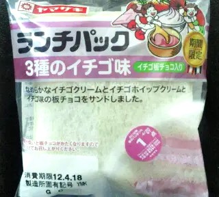今回のランチパックは、2012年4月に発売された 3種のイチゴ味 です。実は1年前の3月に、 ランチパック 3種のいちご味(いちごの板チョコ入り) が登場してます。その 3種のいちご味 を食べた記事には、「もうすぐ春だなと感じます」とのんきな言葉を載せてましたね。その日からまもなくして東日本大震災が発生し、春どころの騒ぎでなくなったのはいうまでもありません。そんなこんなで今年も春がやって来ました。そしてランチパックにもイチゴの季節がやって来ました。去年食べた ランチパック 3種のいちご味 と今年の ランチパック 3種のイチゴ味 とではどこが違うのでしょう。ひと目でわかるのが、去年はひらがなの「いちご」でしたが、今年はカタカナの「イチゴ」になってます。そして去年はいちご色のマーブル柄のパンを使用しました。中身はというと、去年はいちごジャムでしたが今年はイチゴクリームが入ってます。それと去年のホイップクリームからイチゴホイップクリームに変わってます。なんだか長くなりましたが、早速食べてみることにします。
