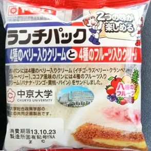 今回のランチパックは、2013年10月に発売された 2つの味が楽しめるシリーズ の、4種のベリー入りクリーム と 4種のフルーツ入りクリームです。これまた随分と沢山の味を使いましたね。イチゴ・ラズベリー・クランベリー・ブルーベリーの4種のベリー入りクリームは白いパンに。バナナ・リンゴ・黄桃・パインの4種のフルーツ入りクリームはココア風味のパンに入れました。ということは、この袋の中に8種類の味が入っている?凄いですねー!中京大学総合政策学部の皆さんとの共同企画製品ということで、沢山の意見が集まってこんなに詰め込んだのでしょうね・・・。さてどんな感じか食べてみることにしましょう。