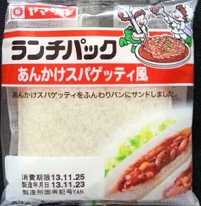 今回のランチパックは、2013年11月に発売された あんかけスパゲッティ風 です。あんかけスパゲッティは名古屋発祥の名古屋メシの1つで、僕も以前名古屋に行った時に食べました。お店は沢山ありますが、僕は名古屋駅近くにある、名鉄レジャック3Fの「あんかけ亭」であんかけスパゲッティを食べた事があります。そのあんかけスパゲッティがランチパックになりました。さてそのお味は・・・?では早速食べてみる事にしましょう。