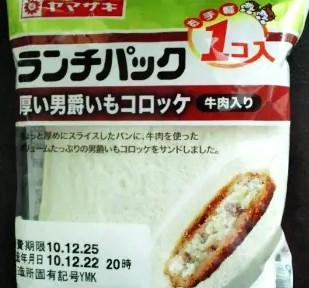 今回のランチパックは、2010年12月に発売された 厚い男爵いもコロッケ です。パッケージの上に「お手軽1コ入」と記載された、ランチパックでは異例の、袋に1枚しか入っていないこの商品。説明文に「ちょっと厚めにスライスしたパンに」とあり、パッケージの写真を見ると、確かにパンの断面が厚くなっています。そのパンにコロッケがはさまれていて、これもそれなりに厚みがあります。ではこのレアなランチパックを、食べてみる事にしましょう。
