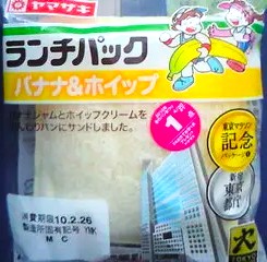 今回のランチパックは、 2010年2月に発売された バナナ&ホイップ です。以前に、ランチパック バナナホイップ が登場していますが、その時はバナナ風味のホイップが入っていました。名前は似ていますが、さて今回どんな味でしょうか?そしてパケージに、東京マラソン記念 のロゴがあります。バナナは栄養補給にもってこいの果物なので、今回のランチパックの素材に採用されたのかもね?では早速食べてみる事にしましょう。