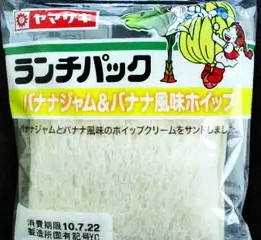 今回のランチパックは、2010年7月に発売された バナナジャム&バナナ風味ホイップ です。今年の初めにおこなわれた、2010 東京マラソン記念パッケージで、ランチパック バナナ&ホイップ が登場しています。なんか今回のランチパックと似てますよね?バナナジャムは同じと思われますが、こちらはバナナ風味のホイップになっています。バナナホイップとバナナ風味ホイップでは、いったい何が違うのでしょう?その違いを確認すべく、食べてみる事にします。