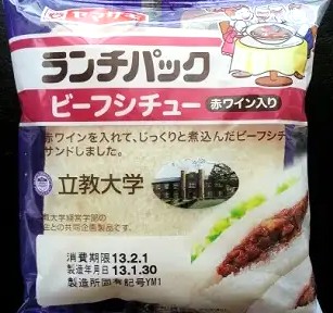 今回のランチパックは、2013年2月に発売された ビーフシチュー です。大学シリーズの最後は、立教大学の登場です。で何故、立教大学とビーフシチューなのでしょう?パッケージの裏に佐々木ゼミの愉快な仲間たちの似顔絵と、「赤ワインを使用したビーフシチューで、おしゃれな立教大学の赤レンガ校舎をイメージしました。」と書かれてます。赤ワイン入りのビーフシチューの色は、立教大学の校舎の色と似ているんですね。そんな立教大学・経営学部の生徒さんと共同企画したランチパックを、早速食べてみる事にしました。