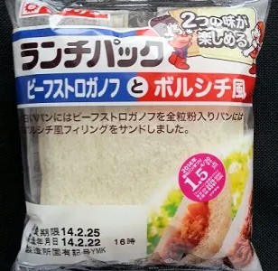 今回のランチパックは、2014年2月に発売された ビーフストロガノフ と ボルシチ風 の、2つの味が楽しめるシリーズです。ソチ冬季オリンピックも終わり、今度はパラリンピックが開催されます。その開催地のソチがある国といえばロシアです。そのロシアを代表する料理が、このビーフストロガノフとボルシチ。この2つの料理の発祥の地や歴史は違いますが、共通して使われているがサワークリームです。僕もそうですが、皆さんロシア料理を普段あまり口にする事がないのでは?少量ではありますが、ランチパックでその味を体験してみましょう。