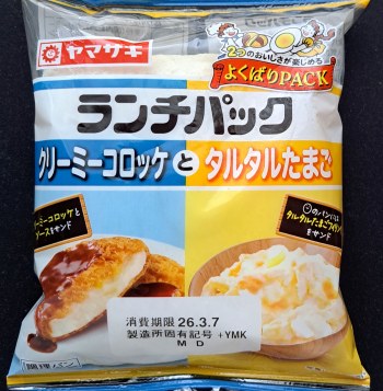 今回のランチパックは、2026年3月に発売された クリーミーコロッケ と タルタルたまご です。パッケージの右上に、「2つのおいしさが楽しめる・よくばりPACK 」の文字がある、これと似た 2つの味が楽しめるシリーズ とは少し違う組み合わせになっています。一目でわかる違いが、パッケージが左右にセパレートされてるデザインで、今回は左が クリーミーコロッケ で、右が タルタルたまご になっています。この2つの共通点といえば、そうですね…僕が思うに「なめらかな食べ心地」でしょうか?「クリーミー」の言葉からしてなめらかそ-なイメージで、「タルタル」はズバリなめらかな食感の具材ですよね。ではなめらかであろ~その2つのランチパックを、早速食べてみる事にしましょう。