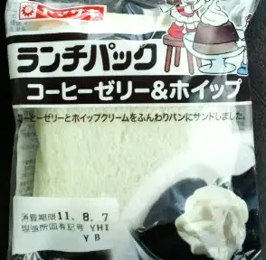 今回のランチパックは、 2011年8月に発売された コーヒーゼリー&ホイップ です。小さい頃にオレンジやイチゴのゼリーをよく食べました。ぷるんとした食感と甘い味。それに加えて冷蔵庫で冷やしたゼリーは、夏にもってこいの喉越しのよさがたまらなく好きでした。そしてコーヒーゼリーをはじめて食べた時、ほんのりとした苦味に「これが大人の味か」と感激をしました。だいぶ昔にどこのメーカーか忘れましたが、グラス型の容器に入ったコーヒーゼリーの容器の下にミルクが別に付いていて、コーヒーゼリーの蓋を開けそこに付属のミルクを上から流し入れ、コーヒーゼリーの黒い表面をゆっくりと白いミルクが覆っていく様が楽しかったです。最近では最初からコーヒーゼリーの上に白いミルクが乗っていて、蓋を開け第一刀のスプーンを入れたとき、ミルクがコーヒーゼリーの中に沈んで行くのが好きです。そんなコーヒーゼリーランチパックになりました。今回はスプーンを使わなくて食べられそうです。では早速食べてみる事にしましょう。