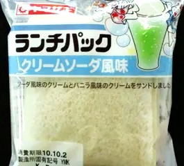 今回のランチパックは、2010年10月に発売された クリームソーダ風味 です。最近ほとんどクリームソーダを飲む事がなくなりましたが、子供の頃はあの鮮やかに透きとおったグリーン色に憧れましたね。グラスの底から幾つもの気泡が上昇し、その上に浮かんだアイスクリームを突っつきながら、ストローでメロンソーダを飲む。徐々にアイスクリームがメロンソーダに溶け落ち、白とグリーンが混じったなんとも微妙な甘さを思い出します。その懐かしいクリームソーダの味が、ランチパックになって登場しました。さてそのお味はいかがでしょう?では早速食べてみる事にしましょう。