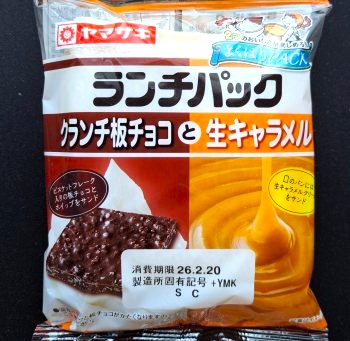今回のランチパックは、2026年2月に発売された クランチ板チョコ と 生キャラメル です。パッケージの右上に、「2つのおいしさが楽しめる・よくばりPACK 」の文字がある、これと似た 2つの味が楽しめるシリーズ とは少し違う組み合わせになっています。一目でわかる違いが、パッケージが左右にセパレートされてるデザインで、今回は左が クランチ板チョコ で、右が 生キャラメル になっています。このシリーズはお惣菜系だけでなく、時には甘い物系が登場します。その違いが、パッケージの右上の「よくばりPACK」が、お惣菜系は赤色に黄色文字で、甘い物系は水色に白文字になっていて、ヤマザキさんのちょっとしたこだわりがうかがえます。このブログでは白文字が目立たないので、文字色を下地色で表現しています。では早速食べてみる事にしましょう。