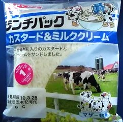 今回のランチパックは、2010年3月に発売された カスタード&ミルククリーム です。ランチパックシリーズでは、日本各地で生産されている牛乳を使用した物が多く、ネーミングも様々です。八千代牛乳を使用したカスタード&ミルクや、蔵王牛乳入りのカスタード清里産牛乳クリーム阿蘇小国ジャージー牛乳入りクリームなど、特にこの阿蘇小国ジャージー牛乳に関しては、クリームダブルクリームが登場してます。そして今回は、千葉県にあるマザー牧場牛乳が入ったランチパックです。ただ違う点は、白いミルククリームが入っているものと、カスタードクリーム牛乳を使用しているものがあります。今回のランチパックは、カスタードクリームマザー牧場牛乳が入っています。さてそのお味はいかがでしょう?では早速食べてみる事にしましょう。