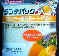 今回のランチパックは、2010年1月に発売された デコポンクリーム&阿蘇小国ジャージー牛乳クリーム です。パッケージの写真でおわかりのように、デコポンは上部が出ている柑橘系の果物です。その九州産デコポンの果汁入りクリームと、九州は熊本の阿蘇小国で育ったジャージー牛の牛乳で作ったクリームが、ランチパックに一緒に入っています。食べる前から、凄く美味しいそうなイメージが浮かびます。では早速食べてみる事にしましょう。