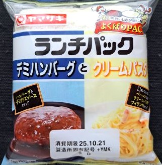 今回のランチパックは、2025年10月に発売された デミグラスハンバーグ と クリームパスタ です。パッケージの右上に、「2つのおいしさがたのしめる・よくばりPACK 」の文字がある、これと似た 2つの味が楽しめるシリーズ とは少し違う組み合わせになっています。一目でわかる違いが、パッケージが左右にセパレートされてるデザインになっています。今回は左が デミグラスハンバーグ で、右が クリームパスタ になっています。このシリーズの意図がいまだわかりませんが、食べればもしかしたら!では早速食べてみる事にしましょう。