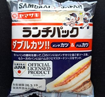 今回のランチパックは、2026年3月に発売された ダブルカツ !! メンチカツ&ハムカツ です。2026年3月に WORLD BASEBALL CLASSIC 2026 が開催され、ヤマザキさんもランチパックでコラボしました。パッケージも侍ジャパンカラーのデザインになっていて、中の具材に勝利を願いを込めて、 メンチカツ と ハムカツ をサンドしました。では早速食べてみる事にしましょう。