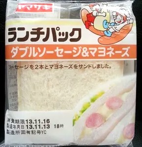 今回のランチパックは、2013年11月に発売された ダブルソーセージ&マヨネーズ です。パッケージの写真を見ていただくと、2本のソーセージが入っているのが分かります。そー、真ん中に丸いのが2つ。ランチパックのソーセージって、以前は大きなソーセージを厚くカットして、それをパンに挟み込んだ物がありました。でも僕等が思うソーセージってこのサイズでは?あれ、僕だけ・・・。とりあえず食べてみましょう。