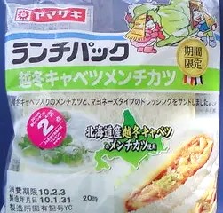 今回のランチパックは、2010年2月に発売された 越冬キャベツメンチカツ です。パッケージには「北海道産越冬キャベツ」と書かれているように、北海道上川郡和寒町越冬キャベツの発祥地です。過去にここ和寒町マイナス41.2℃を記録したそうです。冬の間、雪の下に埋もれたキャベツは、広大な天然冷蔵庫で熟成されることで甘味が出て、はれて越冬キャベツとなって我々の元に届きます。そんなキャベツが入ったランチパックのお味は?では早速食べてみる事にしましょう。