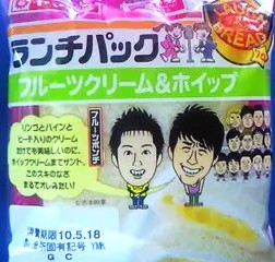 今回のランチパックは、2010年5月に発売された フルーツクリーム&ホイップ です。フルーツと言ったら、真っ先に思い浮かぶのが、只今売る出し中の吉本興業のお笑いコンビ・フルーツポンチです。そのフルーツポンチがお薦めする今回のランチパック。リンゴとパインとピーチが入ったクリームと、ランチパックに欠かせないホイップクリームがサンドされています。見ただけで爽やかな印象を感じるランチパックを、食べてみることにします。
