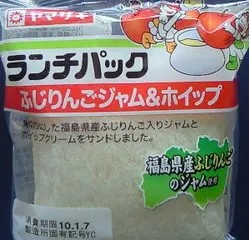 今回のランチパックは、2010年1月に発売された ふじりんごジャム&ホイップ です。りんごを使ったランチパックは、今まで沢山登場してきました。今回のりんごは、福島県産のふじりんごです。りんごの産地は、青森と長野だけではありません。その福島産のりんごを角切りにしたジャムと、ランチパック定番のホイップクリームが一緒になりました。では早速食べてみる事にしましょう。