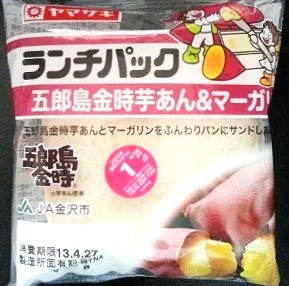 今回のランチパックは、2013年4月に発売された 五郎島金時芋あん&マーガリン です。さて五郎島という所はいったいどこでしょう。ランチパックのパッケージに、JA 金沢市の文字があるので、石川県金沢市と思われますが・・・?見つけました。金沢市の金沢港に面した一角に、五郎島町がありました。ここはさつまいもを育てるのに適した砂地で、五郎島金時芋は加賀伝統野菜の1つに含まれるとの事。歴史的文化が現代にも伝わるくらい、加賀藩は江戸時代に大いに繁栄し、この五郎島金時芋もこの頃に誕生したようです。その加賀藩城下で昔から食べられて来たであろう?五郎島金時芋を使ったランチパックを食べてみたいと思います。