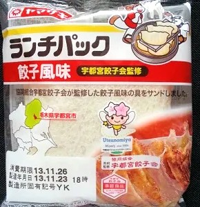 今回のランチパックは、2013年11月に発売された 餃子風味 です。餃子といえば栃木県宇都宮市ですが、最近では静岡県浜松市も取り上げられてます。比べる基準が若干違うようで、浜松市も宇都宮市も両方行った事がある僕の意見として、街中を歩いた感じでは、餃子を売りにしているお店は宇都宮市が多いかな?浜松市の皆さん、ごめんなさい。と言うわけで、今回は協同組合・宇都宮餃子会監修の ランチパック 餃子風味 を食べてみたいと思います。