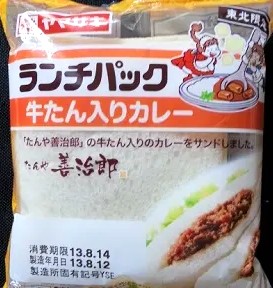 今回のランチパックは、2013年8月に発売された 牛たん入りカレー です。牛たんといえば、やはり宮城県仙台市ですね。仙台市の街中には牛たん専門店が数多く、基本扱っている素材は同じでも、味や焼き具合、そして牛たんの形もお店によってだいぶ違ってきます。仙台駅周辺に数店舗ある「利」が付く有名店や、駅から少し離れた「福」が付く昔ながらのお店など、どこのお店が美味いかは、牛たんだけにその人の舌次第です。そんな数ある牛たん店の中から、今回ランチパックの具材になったのが、たんや善冶郎さんの牛たん入りカレーです。このランチパックを仙台駅で購入したのですが、実はその数分前にたんや善冶郎さんで牛タン定食を食べたばかりでした。仙台駅の三階の牛たん通りがあり、新幹線乗り場方向から来て、三軒目に「たんや善冶郎・牛たん通り店」があります。塩でちょっと硬めに焼かれた牛たんは、噛むと旨味が口の中に広がります。肉厚がお好きな方は「上撰極厚真中たん定食」がお勧めですが、確か数量限定だと思いました。牛たんの話をしていると長くなってしまうので、早速食べてみたいと思います。