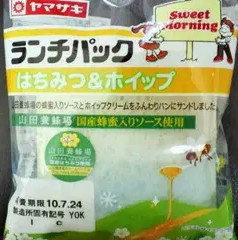 今回のランチパックは、2010年7月に発売された はちみつ&ホイップ です。はちみつはちみつでも、あの有名な山田養蜂場さんの国産蜂蜜入りソースを使っています。以前にもはちみつゼリーランチパックが登場してますが、今回はブランドにこだわったというか、質にこだわったはちみつを使っています。そこで今や日本ではちみつといえば、皆さんご存知の山田養蜂場さんです。これ美味しさに期待が持てそうですね。
