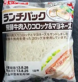 今回のランチパックは、2013年8月に発売された 飛騨牛肉入りコロッケ&マヨネーズ す。全国に多くのブランド牛があり、有名どころからその土地でしか味わえない牛肉まで、今や通販などで購入する事も出来るようになりました。飛騨牛もメジャーな牛肉の1つですが、なかなか高価で、そう易々と口にする事も・・・・。それなら気分だけでも飛騨牛肉を味わいたい。それを叶えてくれるのがヤマザキさん。ちょっと前のランチパックに、飛騨牛肉を使ったカレーがありましたが、今回は飛騨牛肉コロッケです。では早速食べてみる事にしましょう。
