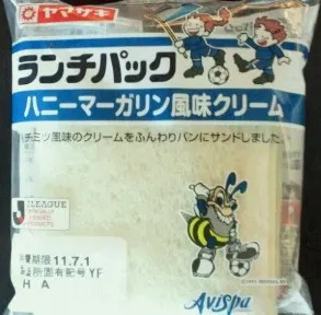 今回のランチパックは、2011年7月に発売された ハニーマーガリン風味クリーム です。それに今回のランチパックのパッケージには、アビスパ福岡のアビー君が描かれてます。だからハニーマーガリンなんですね。ランチパックに時々登場するハニーですが、今回はマーガリンと組み合わせたクリームです。さてそのお味はいかがでしょう?早速食べてみたいと思います。