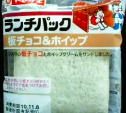 今回のランチパックは、2010年11月に発売された 板チョコ&ホイップで す。板チョコといえば、以前に硬い板チョコのランチパックが登場してます。で今回の板チョコは、パフ入りの板チョコがランチパックの中に入ってます。あの独特の食感を作り出したことは、チョコの革命と言っていいでしょう。この食感が好きという人も多いと思います。では早速食べてみたいと思います。