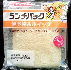 今回のランチパックは、2013年5月に発売された 伊予柑&ホイップ です。愛媛県の名産の1つが、この伊予柑です。瀬戸内海の温暖な気候と、愛媛県の山の傾斜を利用して作られている伊予柑。そうそう愛媛県を訪れた時、宇和島駅から松山駅まで特急列車に乗りました。その時乗った列車がたまたまアンパンマン列車で、オレンジ色の実をつけた山間を走って行きました。あれはみかんなのか伊予柑なのか判別が出来ませんでしたが、緑の山肌に無数のオレンジの点々が鮮やかでした。ではその伊予柑を使ったランチパックを、食べてみる事にしましょう。