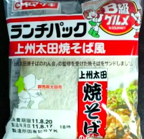 今回のランチパックは、2011年8月に発売された 上州太田焼そば風 です。上州といえば現在で言う所の群馬県を示します。その群馬県の太田市には、現在約80店(2011年当時)の焼そばのお店があるらしい。焼そばで有名な所といえば秋田県横手市や静岡県富士宮市がありますが、関東平野にも焼そばで名乗りをあげた町があったとは。とはいえ太田市は、あえて町おこしの為に焼きそばを扱ったわけではなく、昔からこの町で多くの焼そば店が在ったらしい。その為、もともと太田焼そばの定義は無く、それぞれのお店でオリジナルの焼そばを出していたそうです。最近では「上州太田焼きそばのれん会」を発足し、ある程度の定義を図り全国に広める活動をしています。その上州太田焼そばのれん会が監修を受けた焼そばがランチパックになりました。パッケージの右上に「B級グルメ」の大きなロゴが描かれた、ご当地お勧めのランチパックを、早速食べてみることにします。