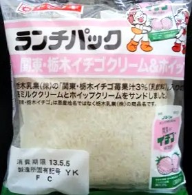 今回のランチパックは、2013年5月に発売された 関東・栃木イチゴクリーム&ホイップ です。お笑いコンビ・U字工事さんが世の中に広めたといっても過言ではない、あのレモン牛乳(関東・栃木レモン)のイチゴバージョンがランチパックになりました。栃木県はレモン牛乳も有名ですが、それ以上に関東・栃木イチゴが有名です。栃木県の苺といえば、とちおとめですね。これもU字工事さんがお勧めしてます。今回ランチパックになった関東・栃木イチゴですが、レモン牛乳と大きく違うところがあります。それはレモン牛乳の無果汁に対し、関東・栃木イチゴは苺果汁3%で、それもとちおとめ苺の果汁3%なのです。ランチパックになっても、ここのところは変わらないと思います?では早速食べてみたいと思います。