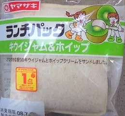 今回のランチパックは、2008年7月に発売された キウイジャム&ホイップ です。この前はマンゴーを食べて、今回はキウイです。このごろトロピカルフルーツが続いていますが、もしかして夏先取りですか?最近では甘いゴールデンキウイも登場していますが、僕は甘酸っぱい緑のキウイが好きです。キウイをまるごと冷蔵庫で冷やして、ハーフカットをキウイ専用のスプーンで食べる・・・これが最高です。それではこのキウイ?ではキウイジャムが入ったランチパックを、食べてみる事にしましょう。