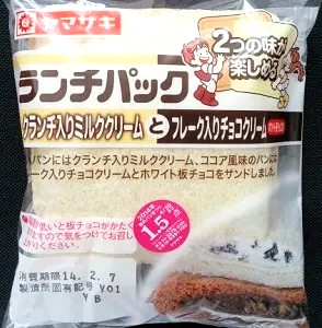今回のランチパックは、2014年2月に発売された 2つの味が楽しめるシリーズ の、 クランチ入りミルククリーム と フレーク入りチョコクリーム です。このシリーズは違った味を楽しむ事が出来ます。今回は味も勿論ですが、クランチとフレークの違った食感の食べ比べも楽しめます。では早速食べてみる事にしましょう。
