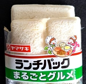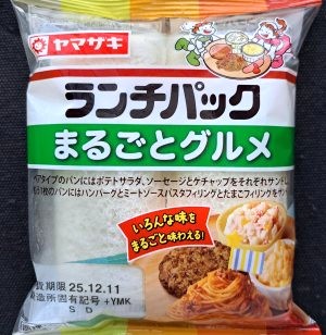 今回のランチパックは、2025年12月に発売された まるごとグルメ です。この「 まるごとグルメ 」というタイトルですが、いろんな物が詰まっている感じで、なんかいいですよね~。ただランチパックでは2枚のパンを使用しているので、普通であれば2つの味に限られますが、今回は通常のパンとペアタイプのパンを使用しています。