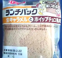 今回のランチパックは、2009年2月に発売された 生キャラメル と ホイップチョコ風味 です。これで2回目の2つの味が楽しめるシリーズです。今回のランチパックは、甘い物がWで登場してきました。生キャラメルは以前に食べましたが、ホイップチョコ風味は・・・?食べたような食べていないような~。ランチパックにはチョコを使った物や、ホイップを使った物も多くありますが、このホイップチョコ風味というのは初めてと思います。ただ「風味」と書かれているのが気になりますが?では早速食べて見ることにします。