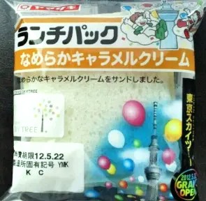 今回のランチパックは、2012年5月に発売された なめらかキャラメルクリーム です。今日2012年5月22日東京スカイツリーの記念すべき開業日です。とはいえ今日の東京はあいにくの雨模様。634メートルの高さを誇る東京スカイツリーからの眺めは・・・・。それでもこのイベントに多くのお客さんが訪れているようです。その東京スカイツリーランチパックコラボということで、ヤマザキさんもこの記念イベントにしっかりと乗っかりました。ランチパックのパッケージには、青空をバックに東京スカイツリーが描かれ、色とりどりの風船が空を飾ってます。本当ならこのような風景が見れたのに残念。パッケージの青空を見ながら食べてみることにしましょう。