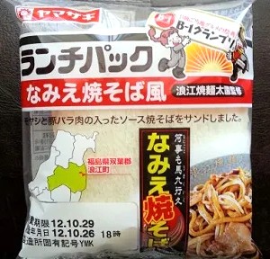 今回のランチパックは、2012年10月に発売された なみえ焼そば風 です。「なみえ」といえば・・・去年3・11の震災で多大な被害を受け、現在も原発事故で非難を強いられている福島県の浪江町の事ですね。今回はB-1グランプリシリーズということで、浪江町で生まれたなみえ焼そばがランチパックになりました。こんな状況の中でもなみえ焼そばは健在で、最近では10月20・21日に開催されたB-1グランプリ in 北九州大会に出場して、惜しくも4位という結果となりました。でも浪江焼麺太国公式ブログによると、北九州大会会場で多くの人達から復興の励ましをいただいた内容がありました。では貴族?騎士?のコスチュームを装い、会場内で一番目立つ浪江焼麺太国監修のランチパックを食べてみたいと思います。