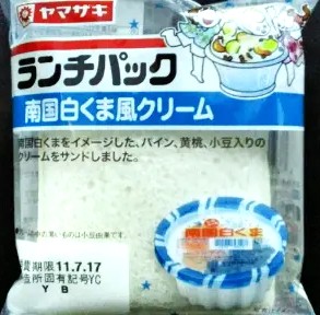 今回のランチパックは、2011年7月に発売された 南国白くま風クリーム です。梅雨があけた途端、毎日のように夏日の猛攻撃。こりゃ~たまりません。う!こりゃ~こおりゃ~氷ゃー?こんな日はかき氷が一番。とはいえランチパックでかき氷はいかがな物かとお思いですが、なんと気分だけでもランチパックでかき氷を楽しむ事が出来ました。あの鹿児島県民が愛する南国白くまがランチパックに登場。このセイカ食品株式会社の南国白くまですが、最近では関東でも売っているし、その味は皆さんご存知と思われます。勿論かき氷がランチパックに入っているわけではありませんが、あの南国白くまの味がランチパックの中に詰まってます。ではこの暑さの中、早速食べてみることにしましょう。