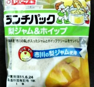 今回のランチパックは、2011年6月に発売された 梨ジャム&ホイップ です。千葉県といえば昔から落花生のイメージですが、千葉県市川市・鎌ヶ谷市・八千代市・松戸市などでが多く作られています。現在では鳥取県が生産量1位ですが、あの二十世紀梨の発祥は千葉県松戸市です。その梨畑が多くある千葉県の中から、「市川の梨」のジャムを使用しました。何故市川の梨かというと、市川市の北部に大町という所が在ります。収穫時期になると農家の直売所が道沿いに並び、いろんな種類のが売られてます。そう市川には街道があるのです。そんな千葉県産市川の梨」ジャムを使用したランチパックを食べてみたいと思います。