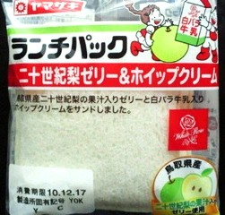 今回のランチパックは、2010年12月に発売された 二十世紀梨ゼリー&ホイップクリーム です。二十世紀梨の生産量の半数近くを占めるのが鳥取県。知っている方も多いと思いますが、実は二十世紀梨が誕生したのは、千葉県松戸市のゴミ置き場からでした。現在松戸市に、二十世紀が丘という住所があります。たぶんその名残だと思いますが、時代の流れもあり、現在では二十世紀梨は鳥取県の名産になりました。その鳥取県の二十世紀梨の果汁入りゼリーをランチパックに閉じ込めました。それに加えて、鳥取県を代表する大山乳業農業協同組合の白バラ牛乳が入ったホイップクリームも一緒にサンドしてます。さて丸ごと鳥取県のランチパックのお味はいかがでしょう。早速食べてみる事にしましょう。