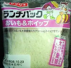 今回のランチパックは、2008年10月に発売された おいも&ホイップ です。イヤ~おいもの季節が到来しましたね!おいもと言っても、ただのおいもではありません。千葉県産ベニアズマのおいもです。千葉県の名産は落花生と思われている方が多いと思いますが、意外にもサツマイモは粗生産額・作付面積と共に全国トップクラスとの事です。そして新たなブランド品として、大栄愛娘(たいえいまなむすめ)と命名されたベニアズマが誕生しました。今回ランチパックのおいもクリームに、その大栄愛娘が使用されました。では早速食べてみる事にしましょう。