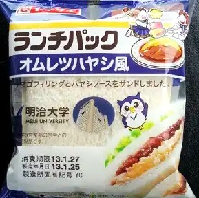 今回のランチパックは、2013年1月に発売された オムレツハヤシ風 です。今月は大学シリーズということで、今回のランチパックのパッケージに、明治大学のキャラクター「めいじろう」と大学の校舎が描かれてます。この校舎リバティータワーの17階に、学生さんに人気の食堂「スカイラウンジ暁」があります。ここのメニューの中で一番人気が、今回ランチパックの具材になったオムレツハヤシです。名前のとおり、若い人が好きなオムレツとハヤシが一緒になった、どこでもありそうで・・・、いやここオリジナルのオムレツハヤシ。味も美味しそうですが、何といても380円という値段が魅力ですね。今回は明治大学の経営学部の学生さんと共同企画したランチパックです。その学生さん達に人気の味を、早速食べてみたいと思います。