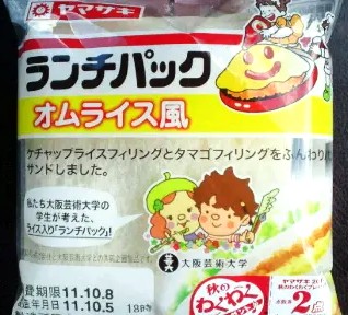 今回のランチパックは、2011年10月に発売された オムライス風 です。なんと!パンとご飯の組み合わせですか。まあオムライス風ですから、ご飯がそのまま入っているわけではありません。でもパッケージを見ると、今回のランチパックは「私たち大阪芸術大学の学生が考えた、ライス入り『ランチパック』!」って書いてあります。ということは、やはりライスが入っているのか!?オムライスが好きな人、結構沢山いると思います。ケチャップライスをふんわり玉子で包んだあの美味しさはたまりません。その美味しさがランチパックで味わえるなんてすばらしい。早速食べてみる事にしましょう。