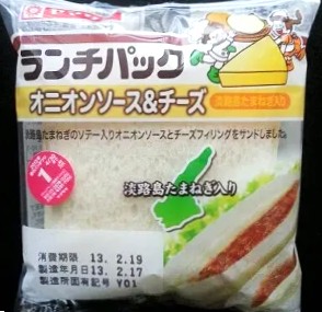 今回のランチパックは、2013年2月に発売された オニオンソース&チーズ です。オニオンソースには淡路島のたまねぎのソテーを入れてます。淡路島のたまねぎ?ちょいと調べてみたところ、多くのたまねぎは春に種を植え夏頃収穫しますが、淡路島のたまねぎは晩秋に植えて冬を越させるらしい。それに加え、海あり・山あり・太陽ありなどの、たまねぎをスクスク育てる好条件がそろってます。その全てがそろうことで、淡路島のたまねぎは甘み成分が豊富らしい。その淡路島のたまねぎが入ったソースがランチパックになりました。